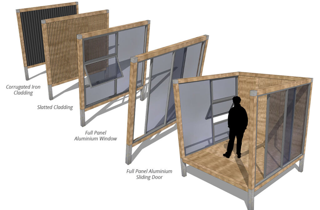 Den modulbaserade träramskonstruktionen har designats för att erbjuda en mängd olika lösningar vad gäller vägg-och takpaneler. Panelerna kan lätt bytas ut för att passa en rad olika boendetilar. Skapa ett glammigt safariliknande lyxtält med mjuka väggar och tak i stretchig kanvas. Bygg en mysig stuga eller en modern zen-bod med klädda träväggar och ett solitt tak. Ta tillvara på varje centimeter av naturen med paneler helt i glas, eller bygg ett rustikt strandskjul med korrugerade aluminiumväggar. Vi kan till och med erbjuda vägglösningar i tyg med tryckta designer som speglar områdets kultur eller natur.